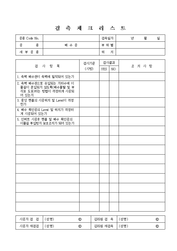 터널공사,배수공,배수공① 검측 체크 리스트입니다.