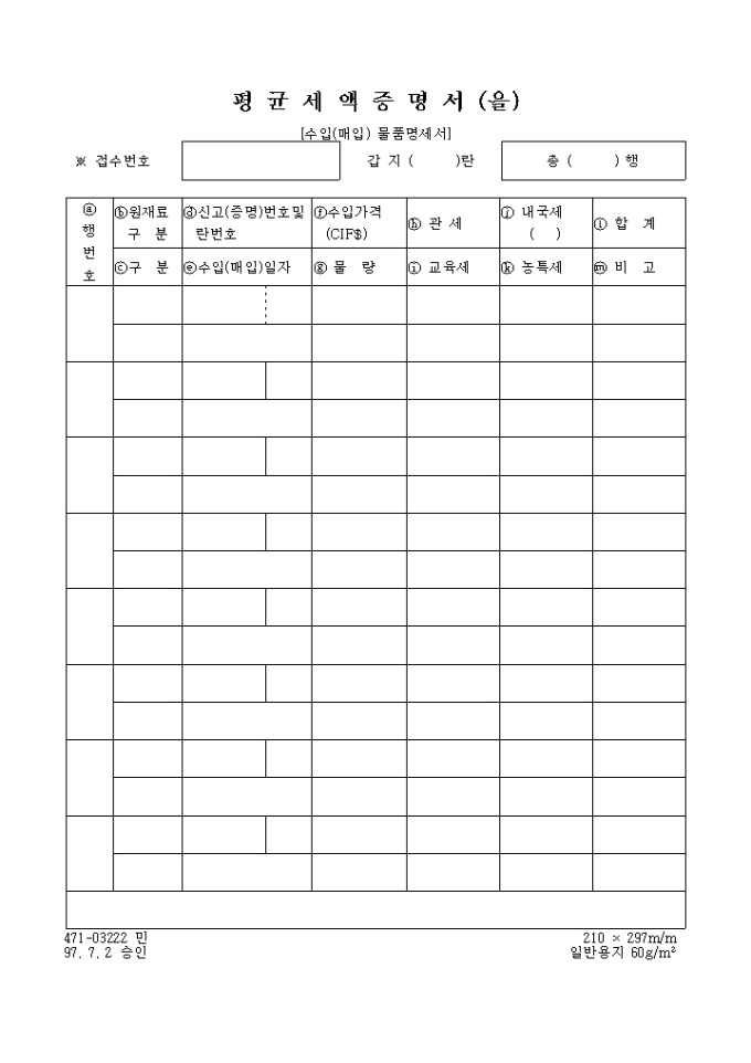 9,000원/월평균 세액증명서(을) 양식입니다. 원재료구분, 수입가격, 관세, 내국세, 합계, 물량, 교육세, 수입일자, 농특세, 비고등으로 구성되어 있으며 수입(매일) 물품명세서로도 평균세액 증명서 양식(을) 입니다.
