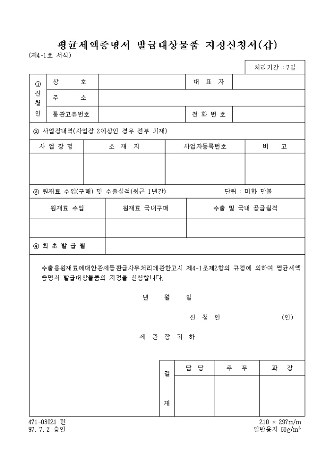 9,000원/월평균 세액 증명서 발급대상 물품 지정신청서(갑) 양식입니다. 수출용 원재료에 대한 관세등 환급 사무처리에 관한 고시 제4-1조 제2항의 규정에 의하여 평균세액증명서 발급대상물품의 지정을 신청할 때 쓰이는 서식입니다.