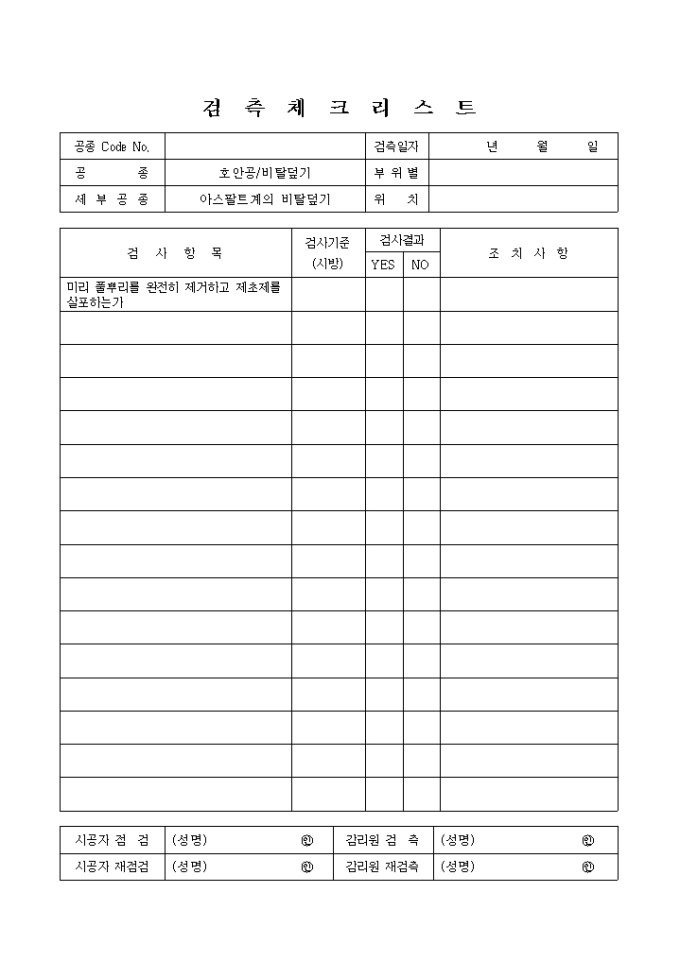 하천공사,호안공-비탈덮기,아스팔트계의비탈덮기 검측 체크 리스트입니다.