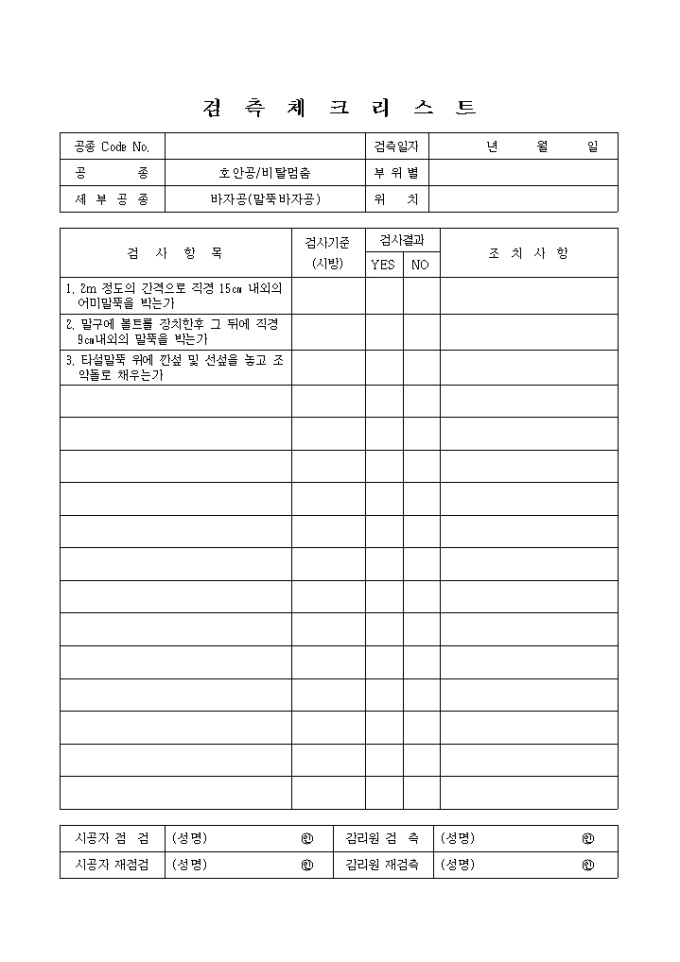 하천공사,호안공-비탈멈춤,바자공(말뚝) 검측 체크 리스트입니다.
