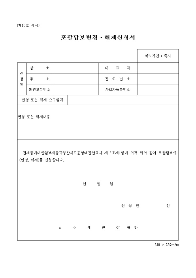 관세등에대한담보제공과정산제도운영에관한고시 제15조제1항에 의거 위와 같이 포괄담보의(변경, 해제)를 신청할 때 쓰이는 제10호 서식입니다.