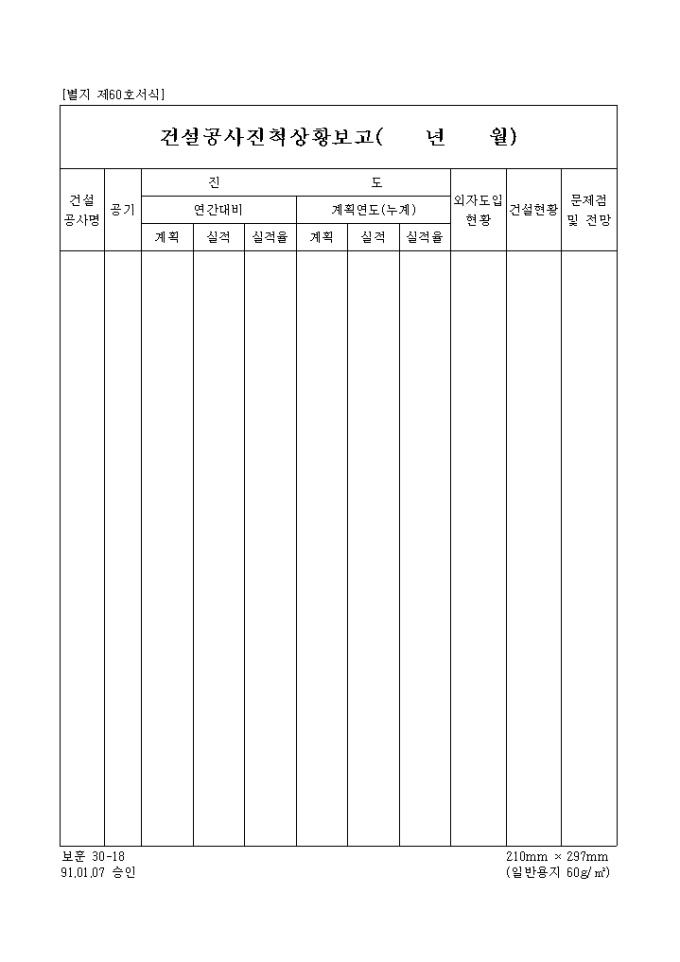 [별지 제60호서식] 건설공사명, 공기, 진도, 외자도입현황, 건설현황등의 항목으로 구성된 건설공사 진척 상황 보고 양식입니다.