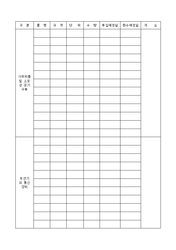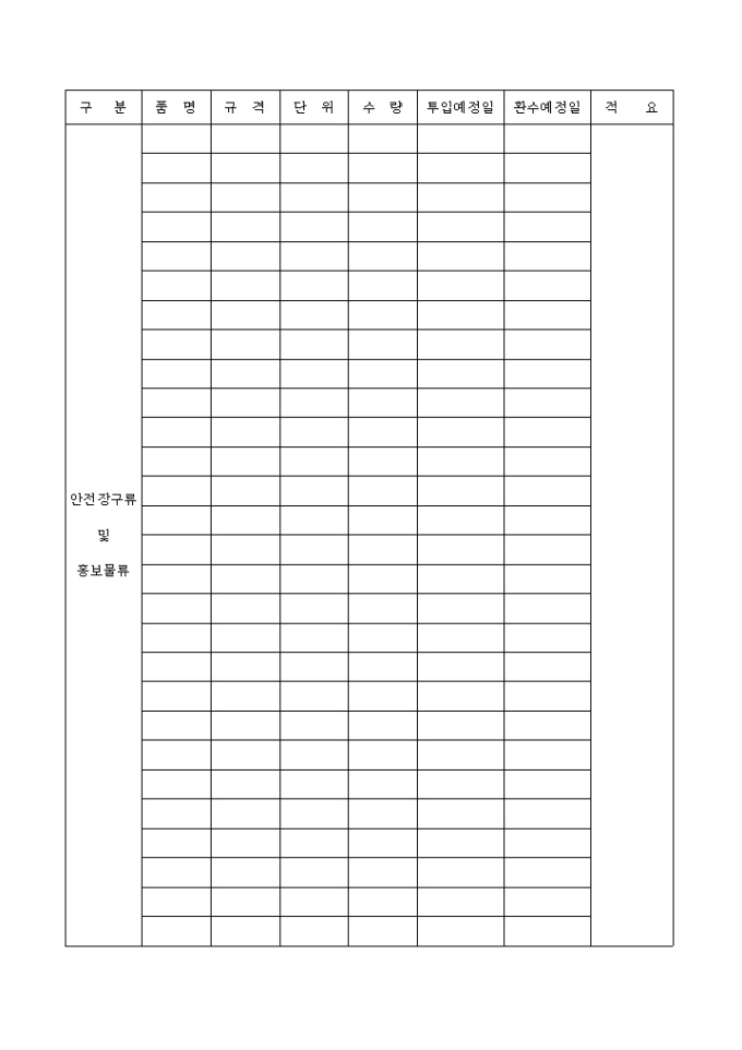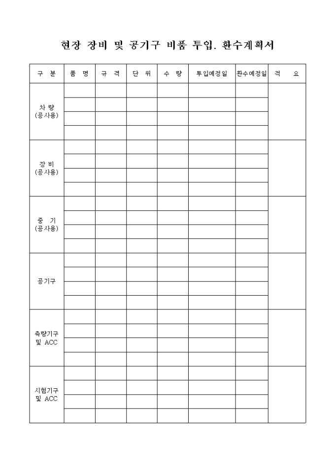 9,000원/월차량,장비,중기,공기구,측량기구 및 ACC 등을 기록하는 현장장비및공기구비품투입,환수계획서입니다.