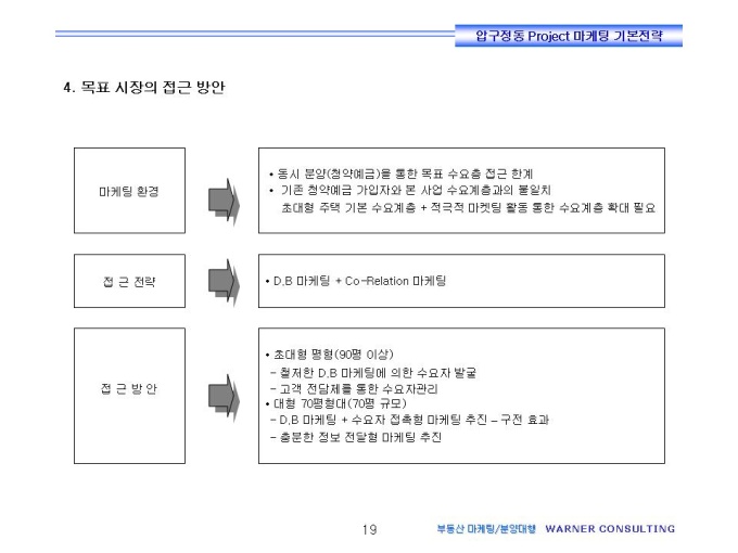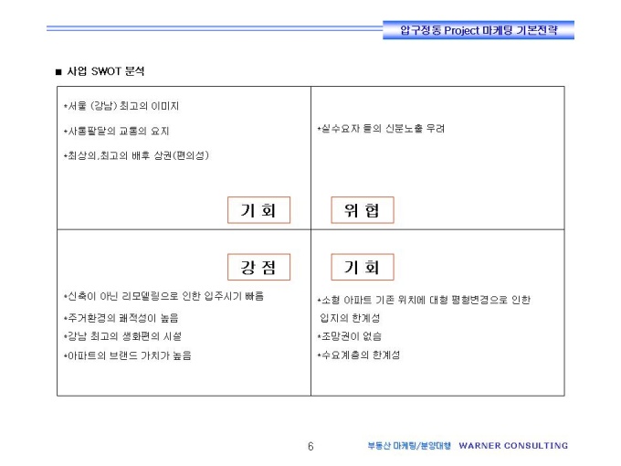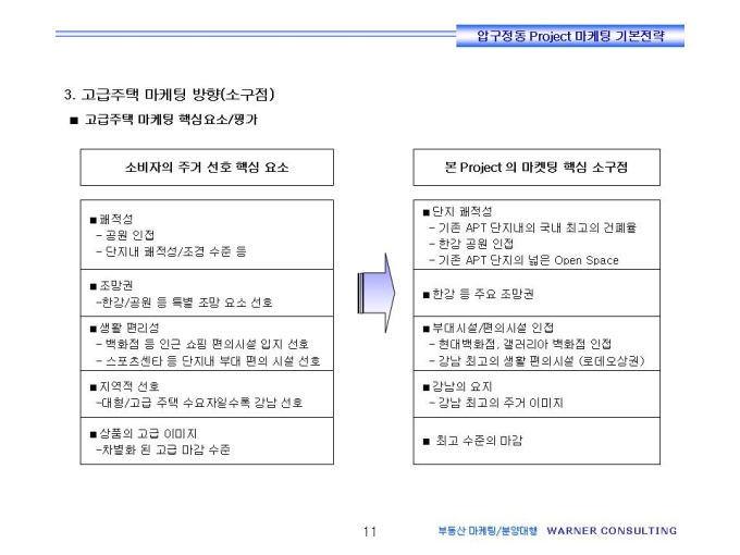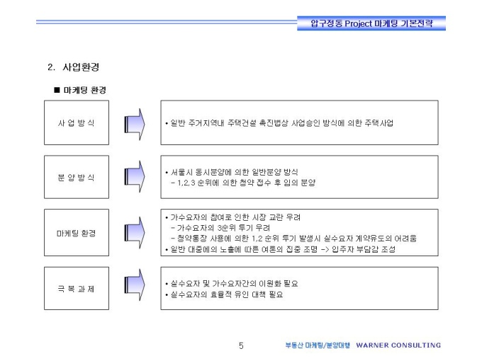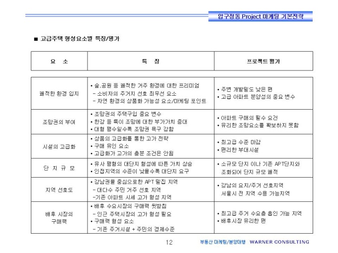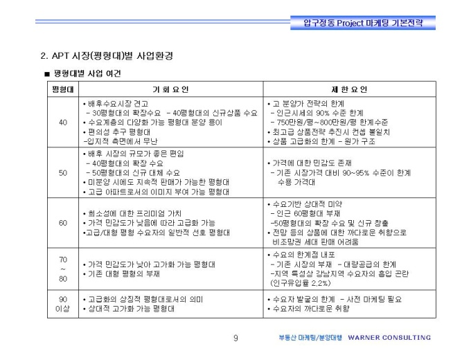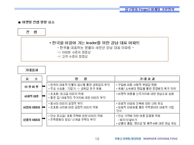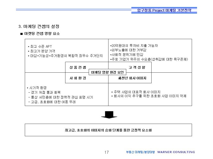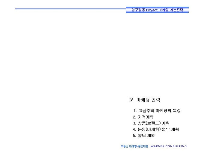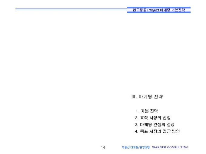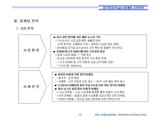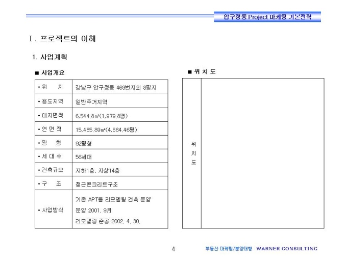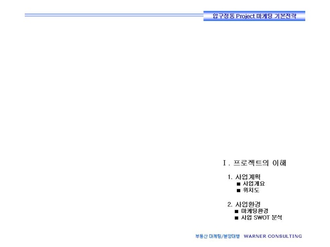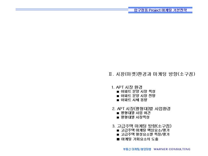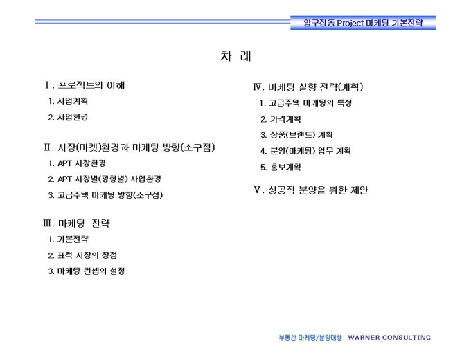 제안서 (건축_리모델링) Ⅰ. 프로젝트의 이해 1. 사업계획 2. 사업환경 Ⅱ. 시장(마켓)환경과 마케팅 방향(소구점) 1. APT 시장환경 2. APT 시장별(평형별) 사업환경 3. 고급주택 마케팅 방향(소구점) Ⅲ. 마케팅 전략 1. 기본전략 2. 표적 시장의 장점 3. 마케팅 컨셉의 설정 Ⅳ. 마케팅 실향 전략(계획) 1. 고급주택 마케팅의 특성 2. 가격계획 3. 상품(브랜드) 계획 4. 분양(마케팅) 업무 계획 5. 홍보계획 Ⅴ. 성공적 분양을 위한 제안