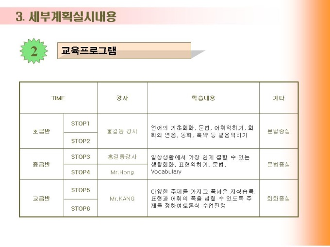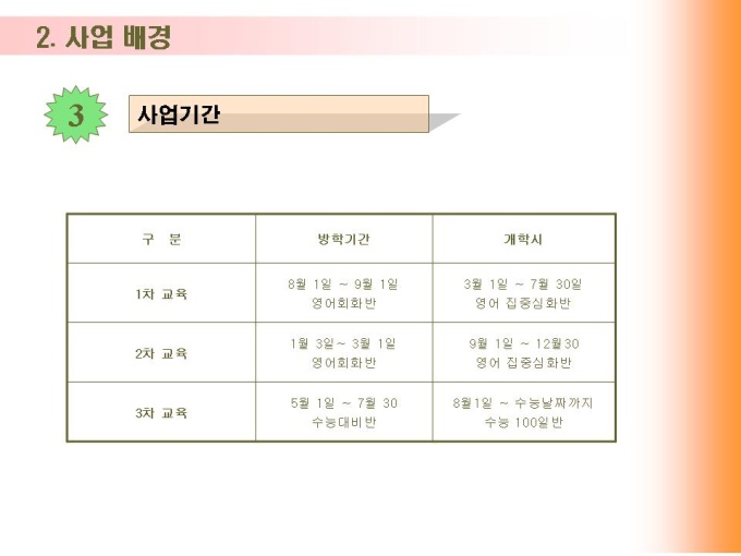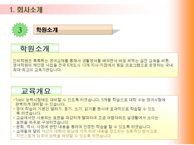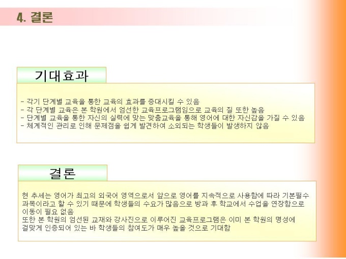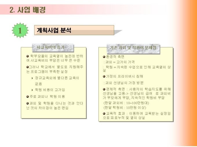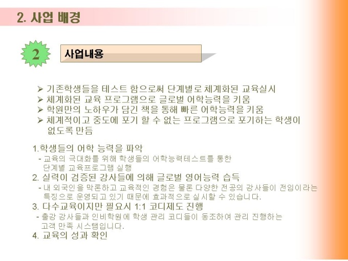 방과후 영어요교육의 사업계획서입니다. 목차는 1.회사개요 2.사업배경 3.세부계획 4.결론으로 구성되어있습니다.