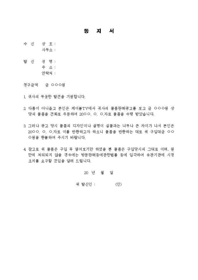 (내용증명)케이블TV 구입상품에 대해 반품하고자 할 때