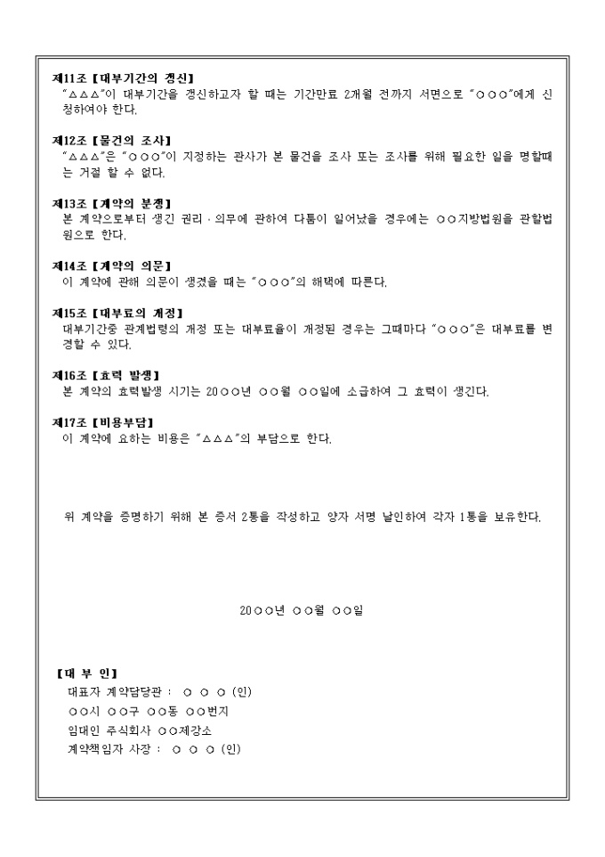 대부인 갑은 차용인 주식회사 ○○제강소와 하기 조항에 의해 국유재산의 대부계약을 체결한다는 토지임대차 계약서입니다. 17개의 계약조항들로 구성되어있습니다. 제1조【대부물건】