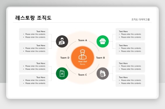 레스토랑 조직도는 PPT 파일 형태로 만들어두면 활용도가 높습니다. 채용 공고에 첨부하거나 신규 직원 온보딩 자료로 쓸 때 별도 변환 없이 바로 활용할 수 있습니다. 또한 인력 변동이 있을 때 해당 도형만 수정하면 되기 때문에 관리가 편리합니다. PPT 기반 레스토랑 조직도 양식을 활용하면 처음부터 직접 만드는 수고 없이 레스토랑 특성에 맞게 바로 수정해서 사용할 수 있습니다.