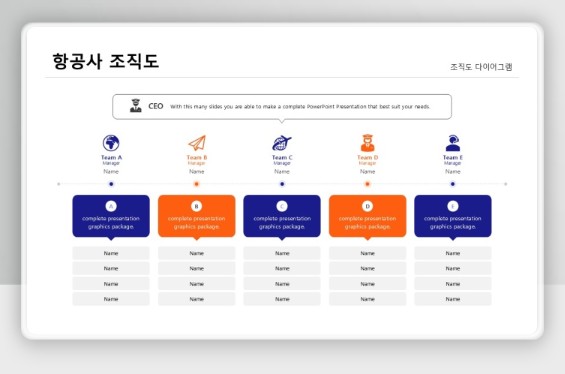 항공사 조직도는 단순한 명단 이상의 의미를 가집니다. 팀별 역할과 협력 구조를 시각화함으로써 내외부 이해관계자 모두가 조직을 빠르게 이해하고 소통할 수 있는 기반이 됩니다. 처음 만드는 경우라면 항공사 특성에 맞게 설계된 PPT 조직도 양식을 활용하면 시간을 크게 절약할 수 있습니다.