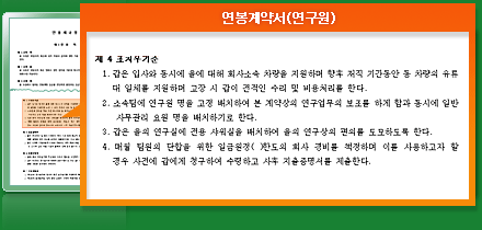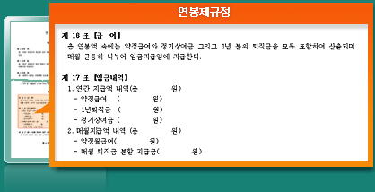 °è¾àÁ÷ »ç¿øÀ» ´ë»óÀ¸·Î ¿¬ºÀ¿¡ °üÇÑ »çÇ× À» ±ÔÁ¤ÇØ ³õÀº °è¾àÁ÷ ¿¬ºÀÁ¦±ÔÁ¤ ÀÔ´Ï´Ù. ¸ñÀû, Àû¿ë, ¿ë¾îÀÇ Á¤ÀÇ, ±Þ¿©ÀÇ Ã¼°è µî 19°³ Á¶Ç×À¸·Î ±¸¼ºµÇ¾îÀÖ½À´Ï´Ù.