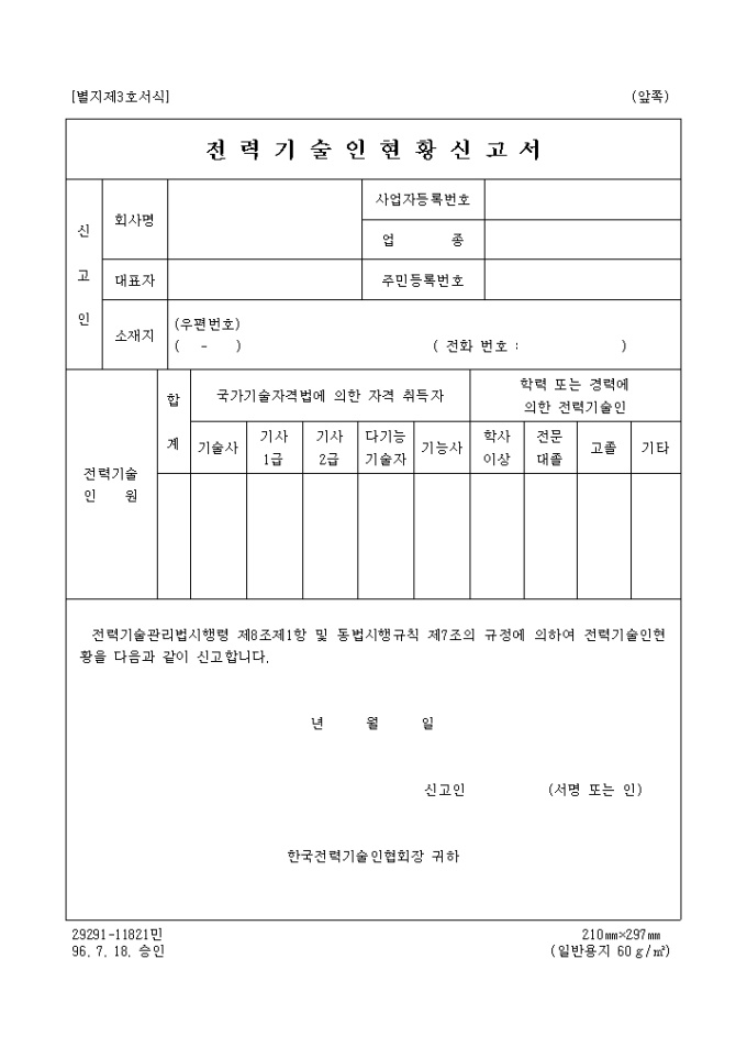 9,000원/월[별지제3호서식] 전력기술관리법시행규칙03서식(96.07.18)-전력기술인현황신고서(앞면) 입니다. 전력기술관리법시행령 제8조제1항 및 동법시행규칙 제7조의 규정에 의하여 전력기술인현황을 다음과 같이 신고하실때 사용하는 양식입니다.