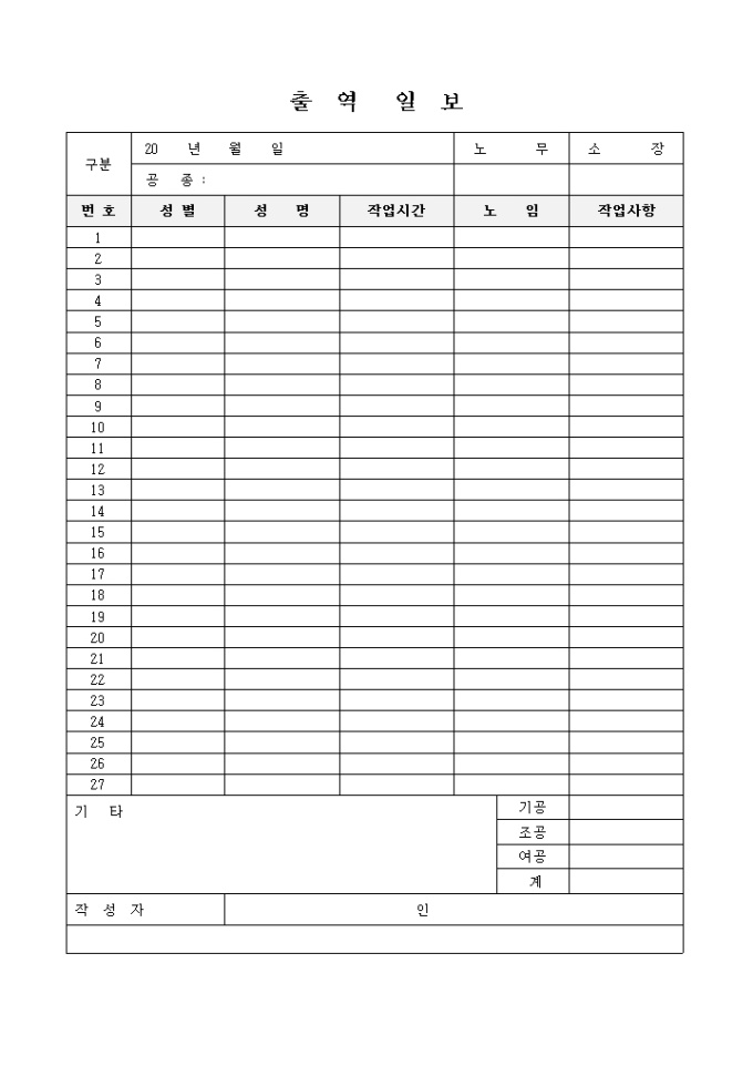 9,000원/월성별, 성명, 작업시간, 노임, 작업사항을 기록하는 출역일보입니다.