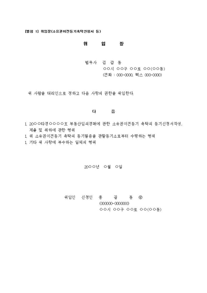 9,000원/월소유권이전등기촉탁신청서 (경락이전) [벌쳠 1] 위임장 (소유권이전등기촉탁신청서 등)입니다.