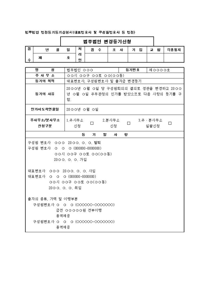 9,000원/월법무법인 변경등기등기신청서(대표변호사 및 구성원변호사 등 변경)입니다.