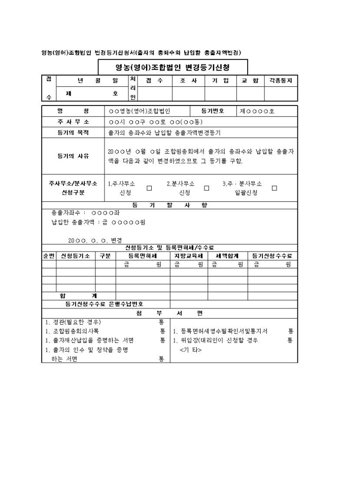 9,000원/월영농(영어)조합법인 변경등기신청서(출자의 총좌수와 납입할 총출자액변경)입니다.