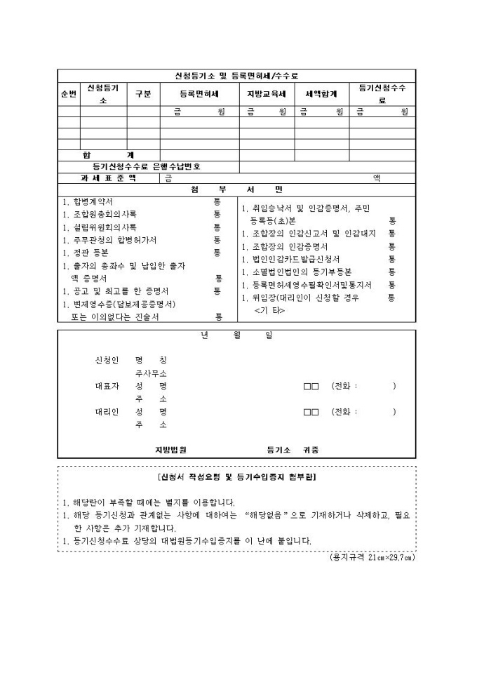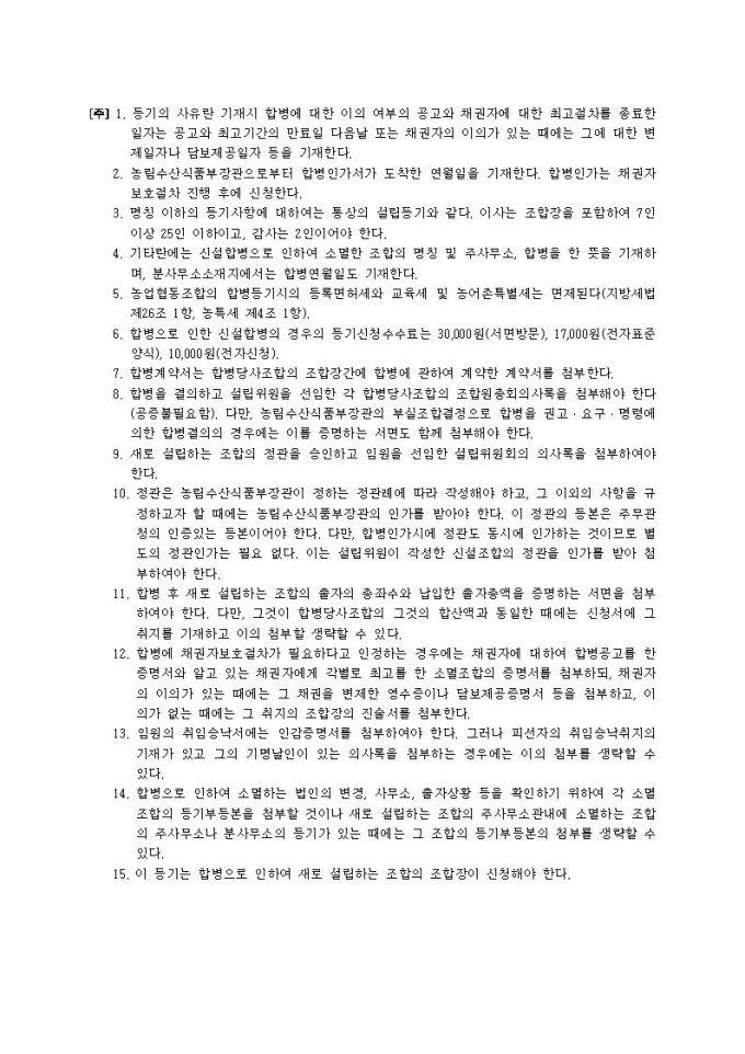 9,000원/월합병으로 인한 농업협동조합 설립등기신청서(신설합병시 새로 설립하는 농업협동조합에서 신청하는 경우)입니다.