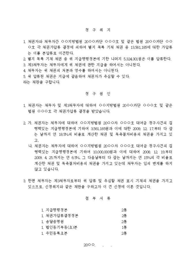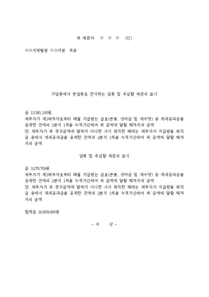 9,000원/월가압류에서 본압류로 이전하는 채권압류 및 추심명령신청서입니다.