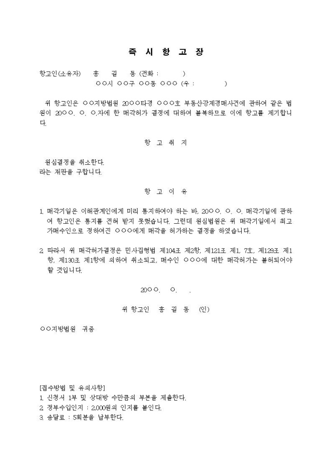 9,000원/월매각허가결정에 대한 즉시항고장(이해관계인에게 미통지)입니다.