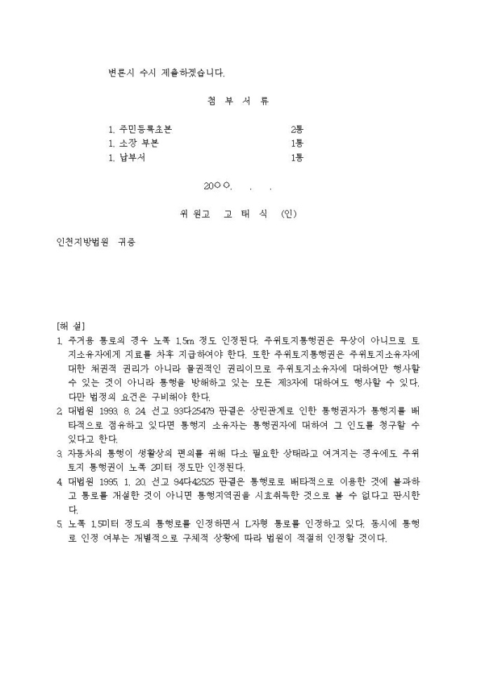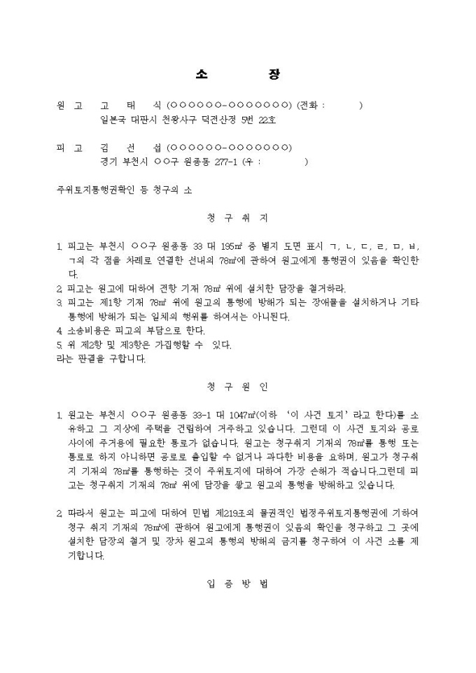 9,000원/월주위토지통행권확인청구 소장(법정주위토지 통행권, 통행지역권의 시효취득)입니다.