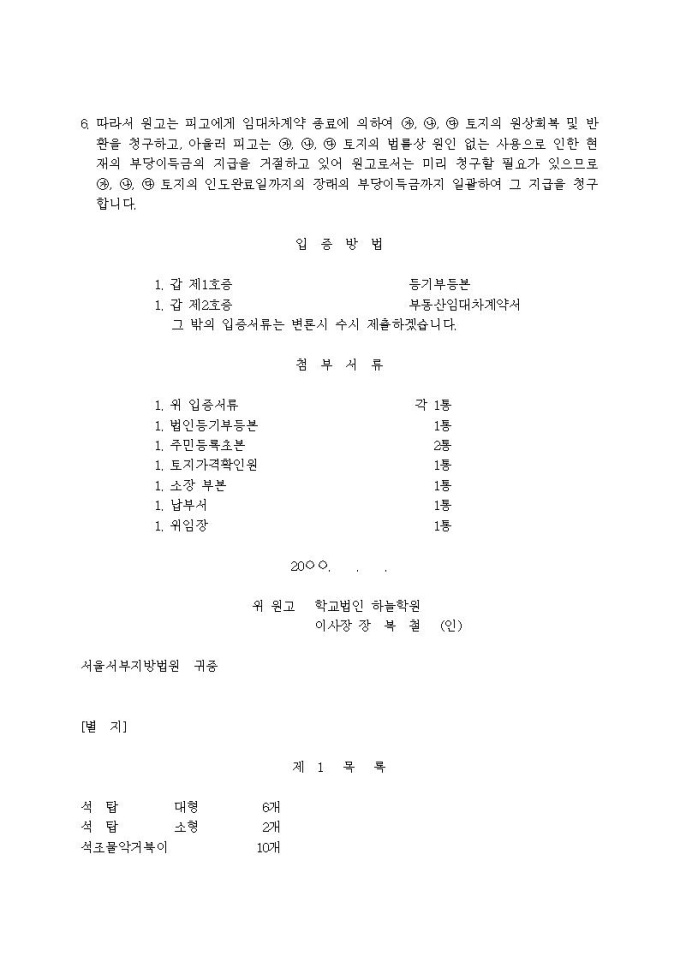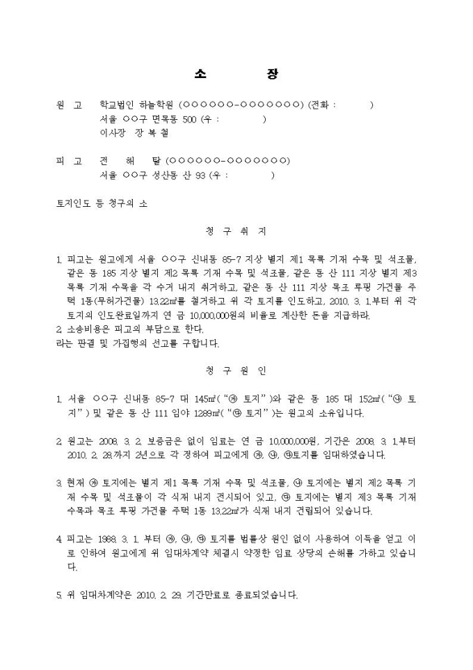 9,000원/월토지인도등청구 소장(토지인도, 부당이득, 임대차종료, 건물철거, 장래이행청구사건)입니다.