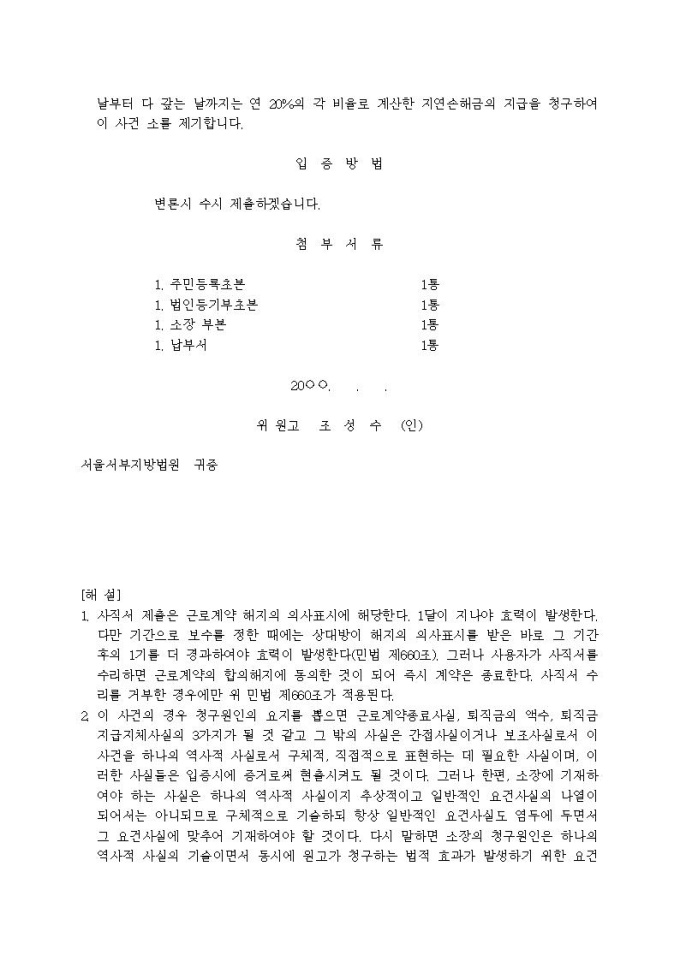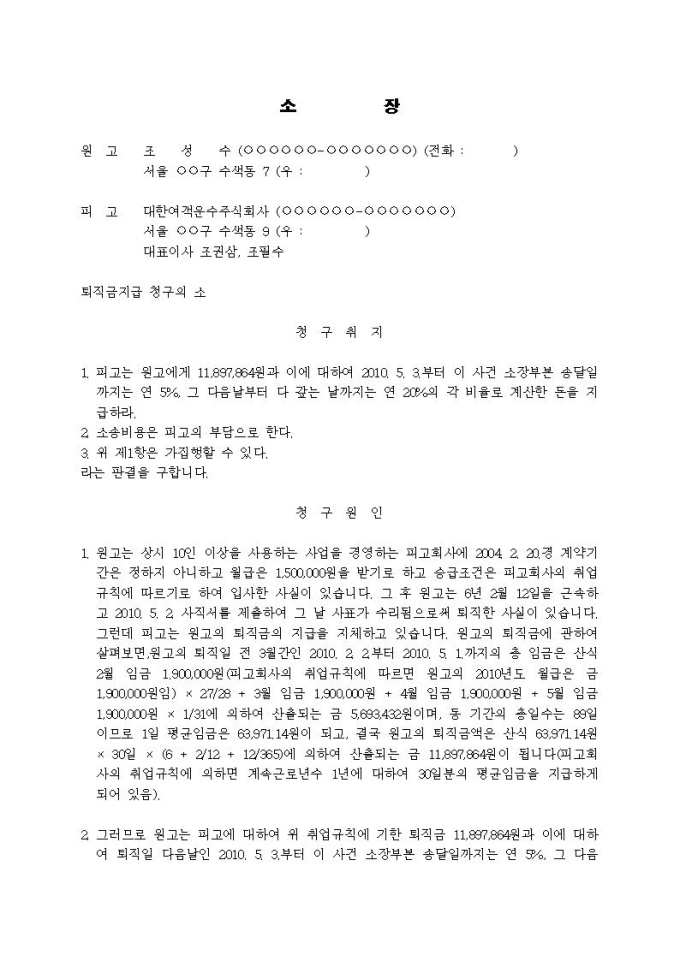 9,000원/월퇴직금청구 소장(근로계약, 계약종료, 취업규칙, 퇴직금산출과정, 사직서제출의 효력)입니다.