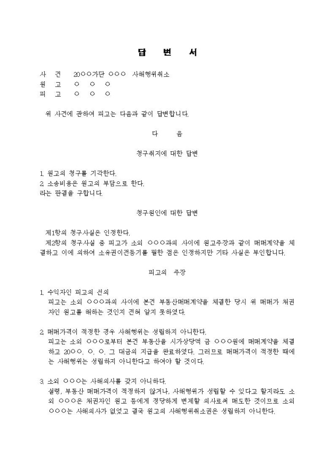 9,000원/월(답변서)사해행위취소(피고의 선의 등)입니다.
