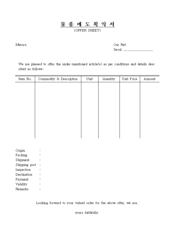 9,000원/월물품매도확약서(offer sheet) Messrs. Our Ref. Seoul ......... We are pleased to offer the under-mentioned article(s) as per conditions and details described as follows: ...