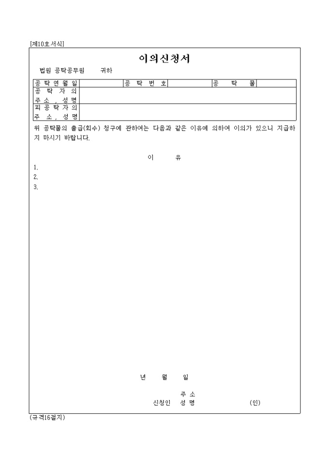 9,000원/월제10호서식 공탁물의 출급(회수) 청구에 관하여 는 기재한 이유에 의하여 이의가 있으니 지급하지 말기를 바랄때 사용하는 양식입니다.
