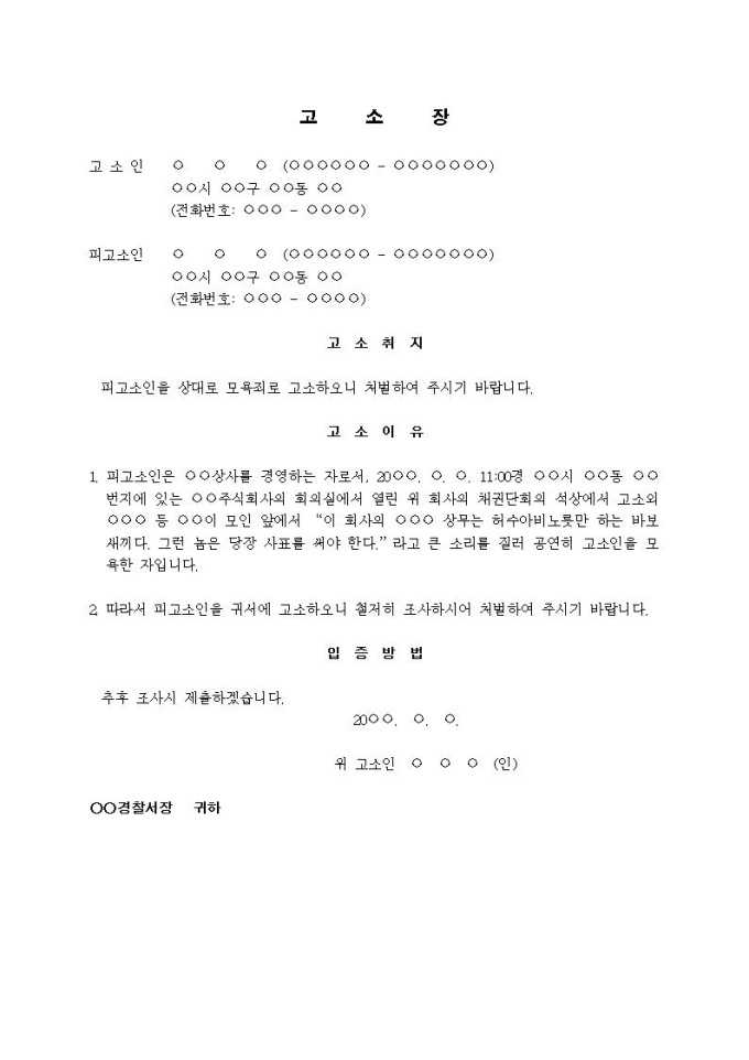 9,000원/월(고소장)모욕죄(회의 석상에서 회사 상무를 모욕)입니다.