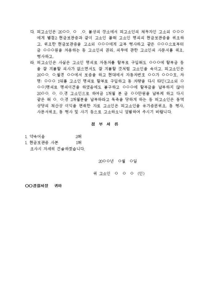 9,000원/월(고소장)유가증권 위조 등(약속어음, 현금보관증 위조 및 할부금 편취 등)입니다.