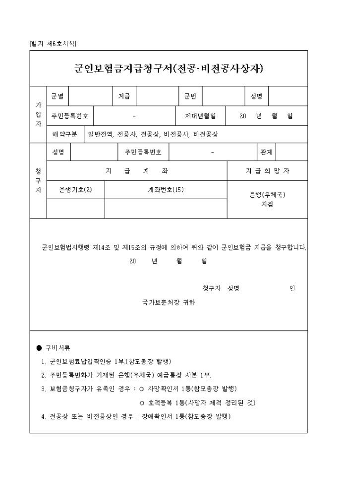 9,000원/월군인 보험금 지급청구서(전공,비전공사상자) 양식입니다. 군인보험법시행령 제14조 및 제15조의 규정에 의하여 전공,비전공사상자에 대한 보험금 지급을 청구할 때 쓰이는 양식입니다.