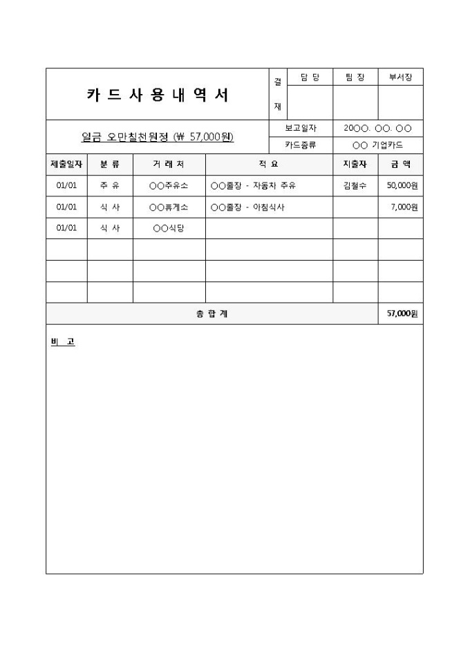 9,000원/월카드사용내역서입니다. 제출일자, 분류, 거래처, 적요, 지출자, 금액, 총합계, 비고, 결재란 등의 항목으로 구성되어 있습니다.
