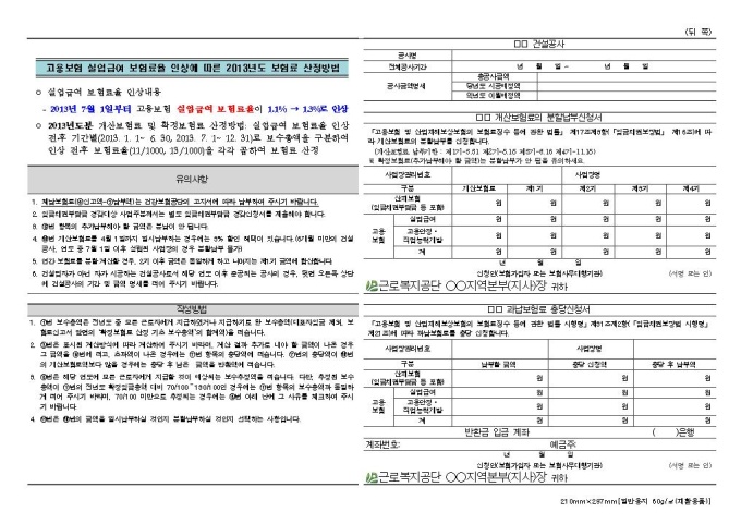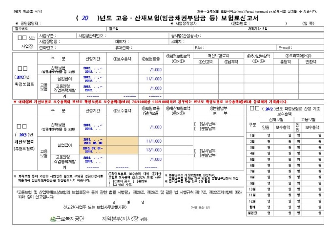 9,000원/월보험료신고서 서식 (13년 실업급여 요율인상 반영-개산보험료신고용)입니다. * 출처 : 근로복지공단(http://www.kcomwel.or.kr)