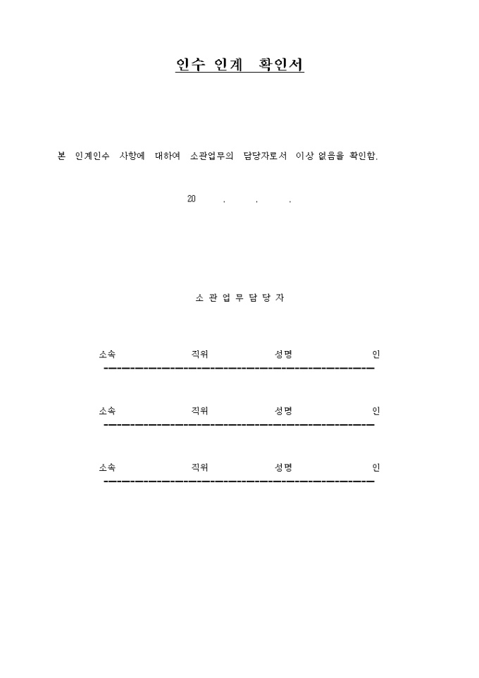 9,000원/월인수 인계 확인서 양식입니다. 본 인계인수 사항에 대하여 소관업무의 담당자로서 이상 없음을 확인함. ...