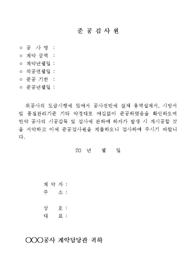 9,000원/월준공검사원(기본)입니다. 공사명, 계약금액, 계약년월일, 착공연월일, 준공기한, 준공년월일 등의 항목과 준공에 대한 확인, 하자발생시 지소공에 대한 내용으로 구성되어 있습니다. 준공검사원은 공사계약 관련 서류 중 하나로 공사의 이행 완료시 준공계와 함께 제출합니다.