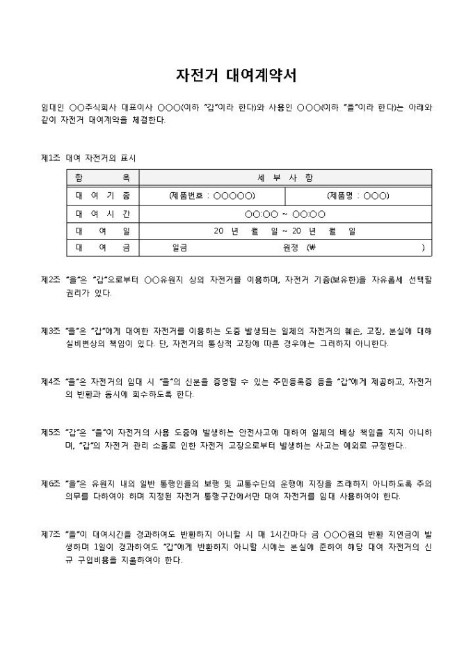 9,000원/월자전거 대여계약서 입니다. 7개 조항으로 구성되었으며, 대여 기종 및 시간, 일수으로 구성되었습니다. 대여물품을 간편하게 작성할 수 있습니다.