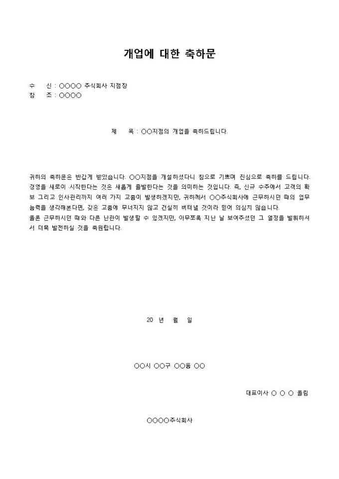 9,000원/월개업축하글 입니다. 개업의 축하글이 기입되었으며, 앞으로의 무궁한 발전을 기원하는 내용이 주된 포인트 입니다. 내용의 첨삭에 용이한 양식입니다.