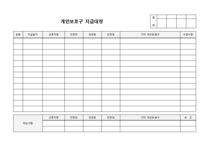 9,000원/월개인보호구지급대장 입니다. 지급대장, 근로자명, 안전모, 안전화 등으로 구성되었습니다. 반납 이후 파손사항까지 파악할 수 있습니다.