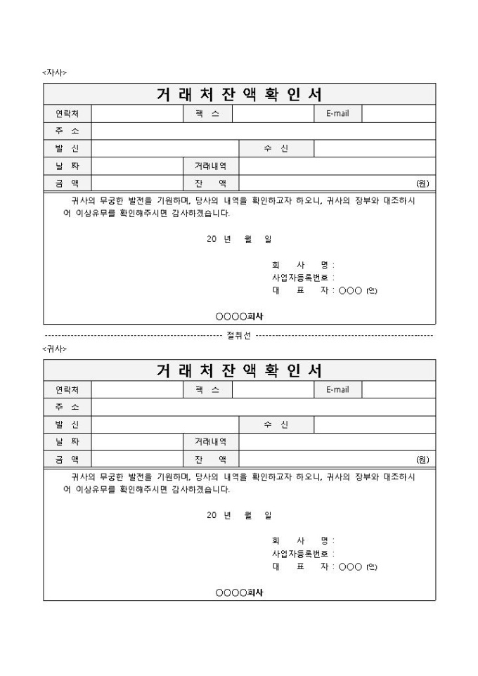 9,000원/월거래처잔액확인서 입니다. 연락처, 주소, 발신, 날짜, 금액, 거래내역, 잔액, 팩스 등으로 구성되었습니다. 증여 및 보관에 용이합니다.