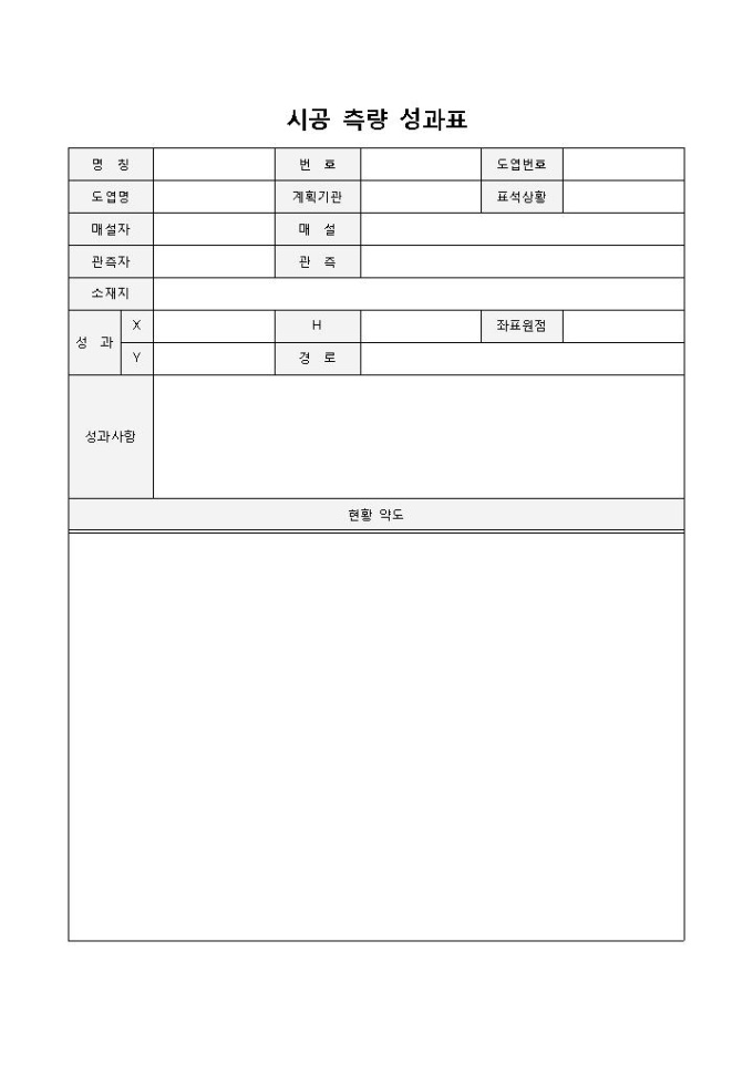 9,000원/월시공측량성과표 입니다. 명칭, 도엽명, 번호, 계획기관, 도엽번호, 표석상황 등으로 구성되었습니다. 시공 측량과 관련된 성과내역을 작성하고 그와 관련된 약도를 기입하여 보다 구체적으로 보고할 수 있습니다.
