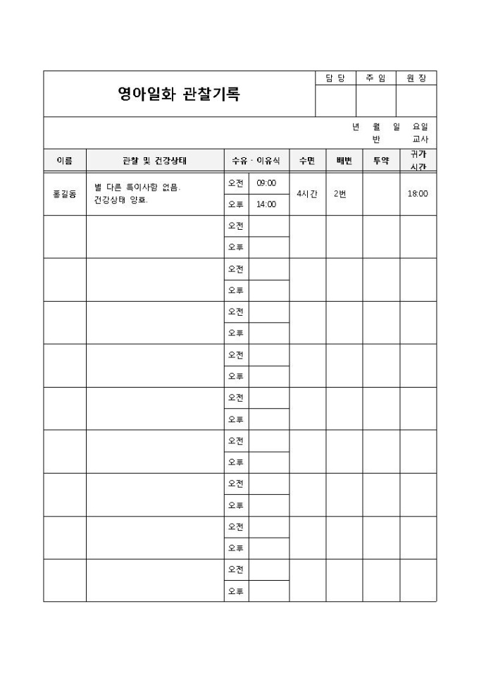 9,000원/월보육기관에서 영아의 일화를 관찰하거나 기록할 때 사용되는 영아일화 관찰기록 양식입니다. 이름, 관찰 및 건강상태, 수유, 이유식, 귀가시간 등의 항목으로 구성되어 있습니다.