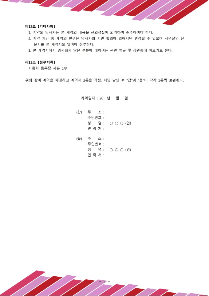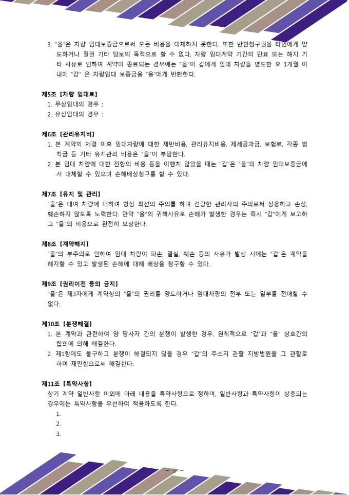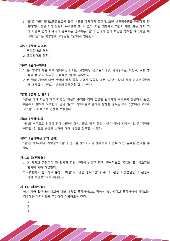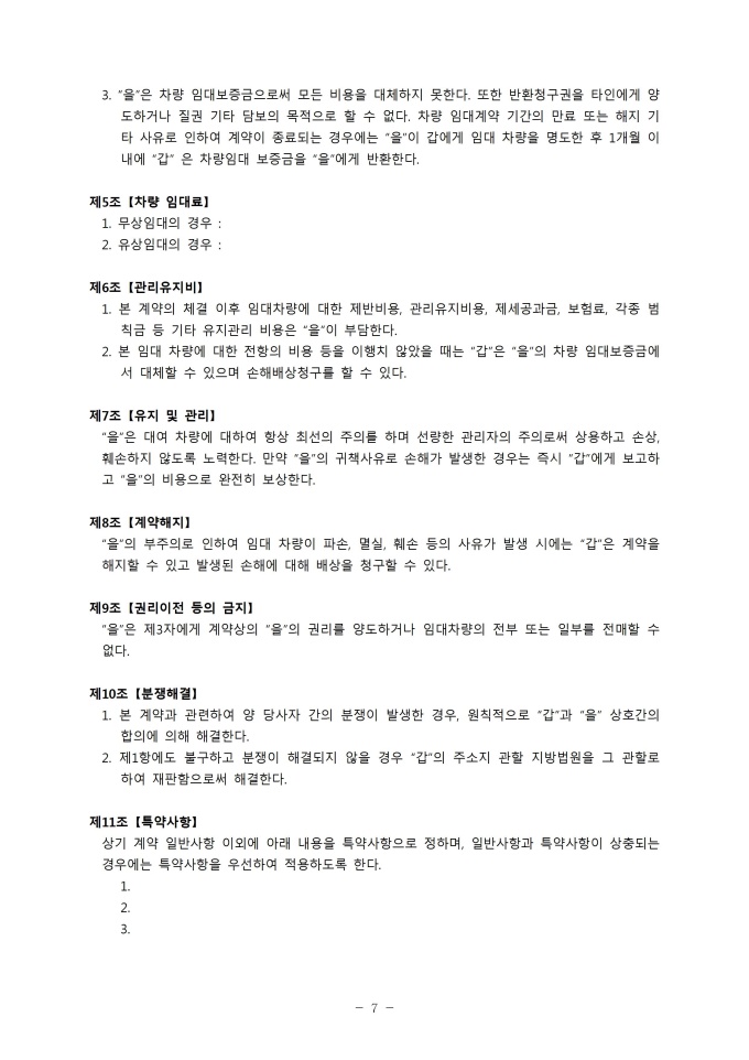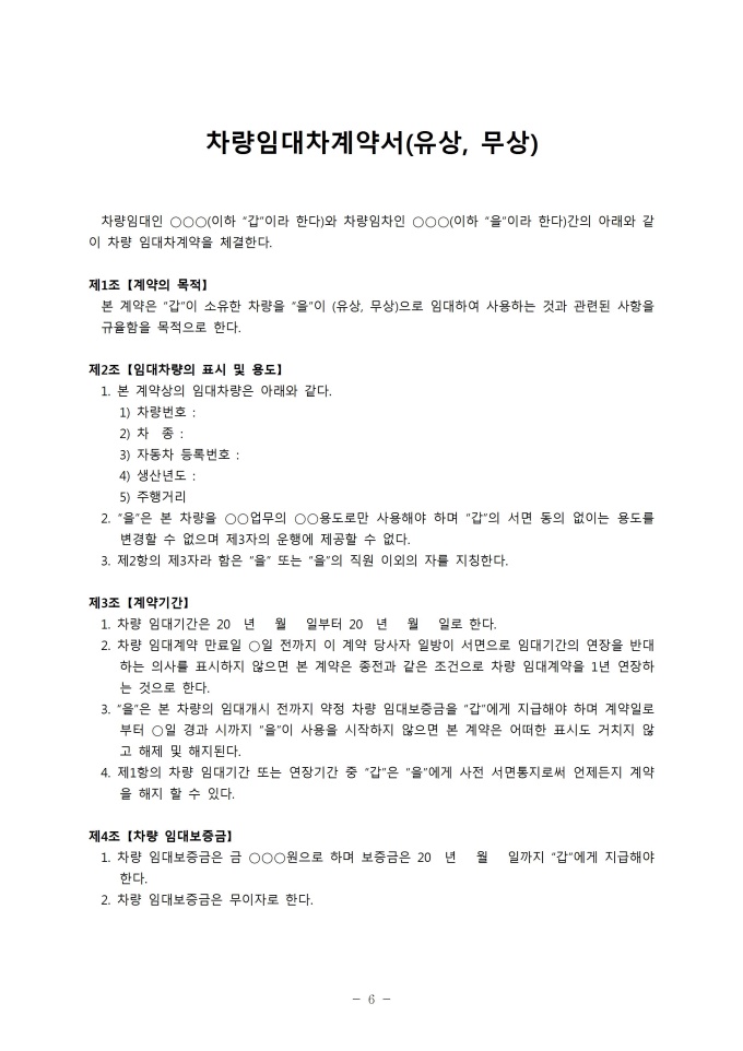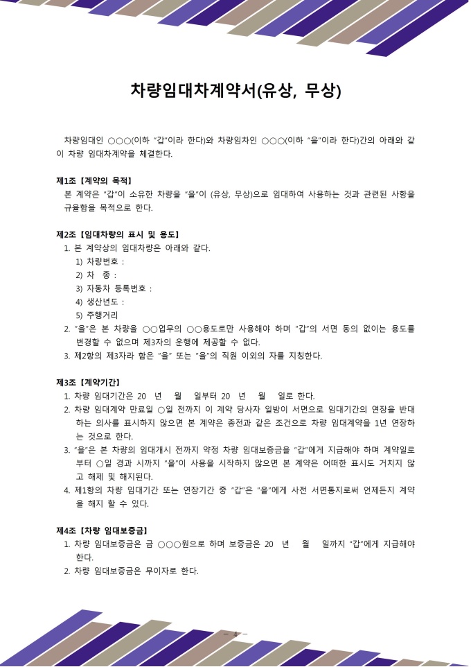 9,000원/월차량임대계약서(유상무상)입니다. 계약의 목적, 임대차량의 표시 및 용도, 계약기간, 차량임대보증금 등의 항목으로 구성되어 있습니다. 총 13조항으로 이루어져 있으며 제 2조 임대차량의 표시 및 용도, 제 5조 차량임대료, 제 11조 특약사항을 기입하여 사용할 수 있습니다. 유상임대 무상임대를 선택하여 사용할 수 있는 계약서 양식입니다. ※ 한글 파일은 알집(Zip)를 다운로드 받아주시기를 바랍니다.