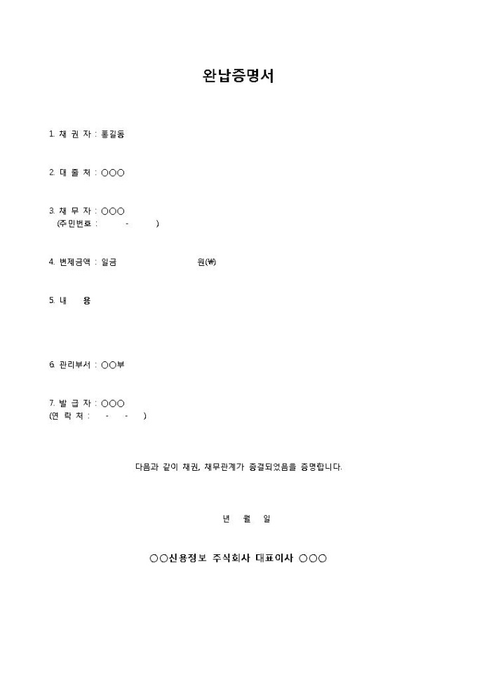 9,000원/월채권과 채무 관계가 마무리되었음을 증명할 때 사용되는 완납증명서 양식입니다. 채권자, 채무자의 인적사항, 대출처, 변제금액, 내용 등의 항목으로 구성되어 있습니다.