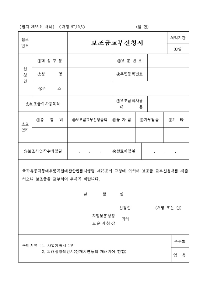 9,000원/월보조금교부신청서 양식입니다. 국가유공자등예우 및 지원에 관한 법률시행령 제75조의 규정에 의하여 보조금 교부신청서를 제출하오니 보조금을 교부 신청을 하고자 할 때 쓰이는 양식입니다.