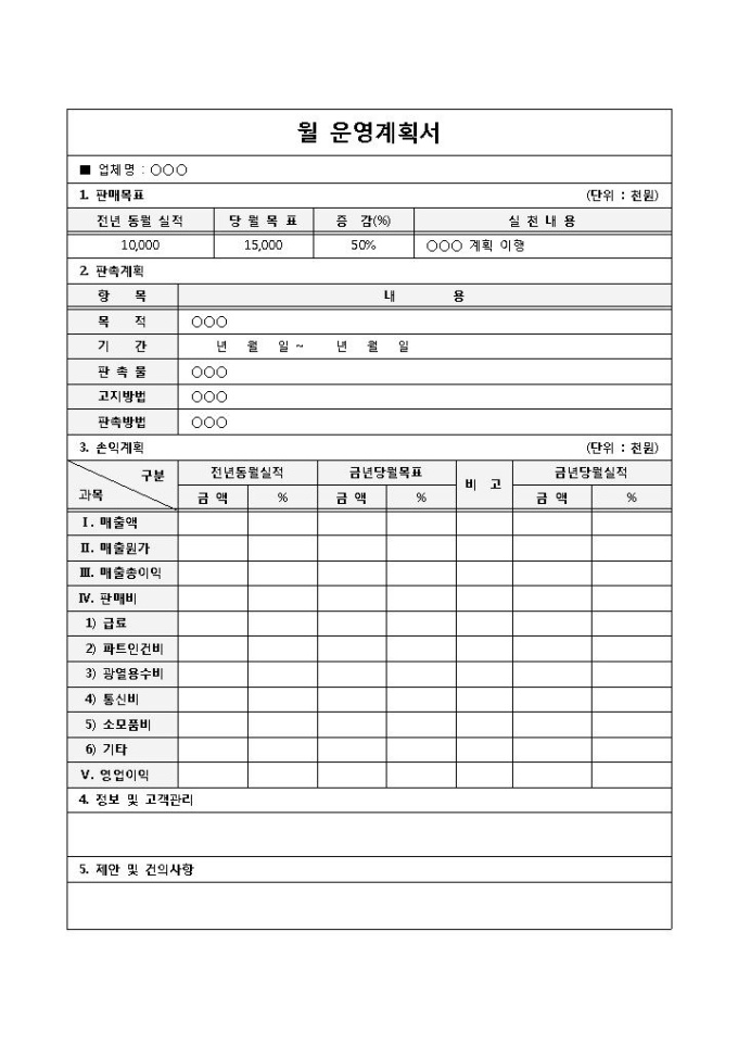 9,000원/월월간 판매목표나 판촉, 손익의 계획 및 목표를 세울 때 사용되는 월 운영계획서 양식입니다. 업체명, 판매목표, 판촉계획, 손익계획, 정보 및 고객관리, 제안 및 건의사항의 항목으로 구성되어 있습니다.