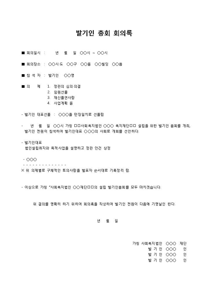 9,000원/월재단의 설립을 위한 발기인 총회를 개최하고 발기인 전원이 참석하여 발기인대표의 사회로 개회를 선언한다는 내용의 발기인 총회 회의록 양식입니다. 회의일시, 회의장소, 참석자, 의제 등의 항목으로 구성되어 있습니다.