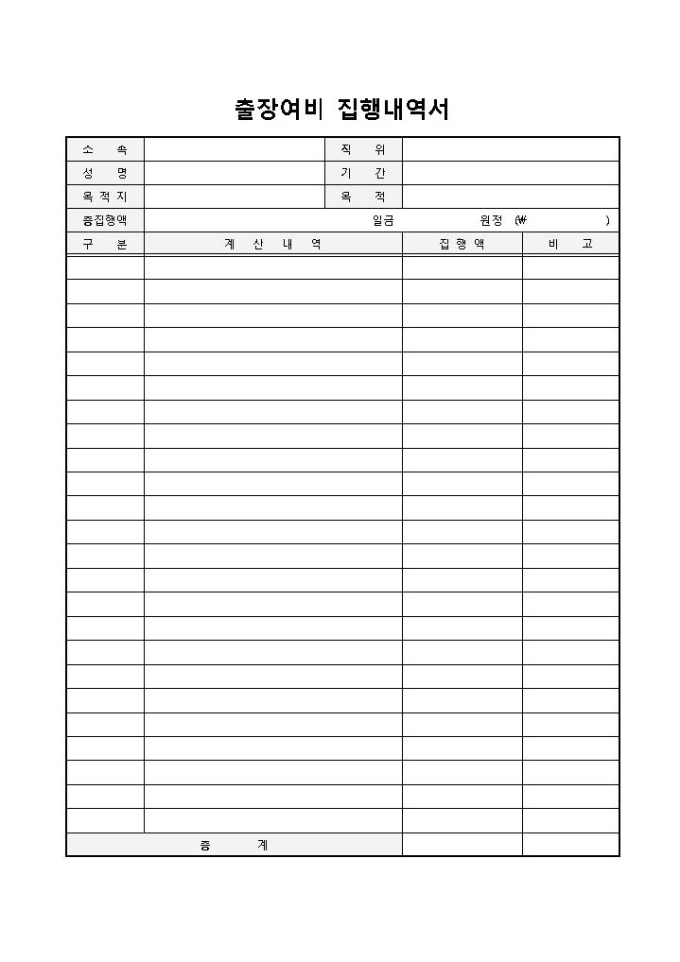 9,000원/월출자여비 집행내역서입니다. 소속, 직위, 성명, 기간, 목적지, 목적, 총집행액, 구분, 계산내역, 집행액, 비고로 구성되어 있습니다. 기업에서 영업에 대한 출장 여비를 집행하고 이에 대한 내역서로 작성하여 사용할 수 있습니다.