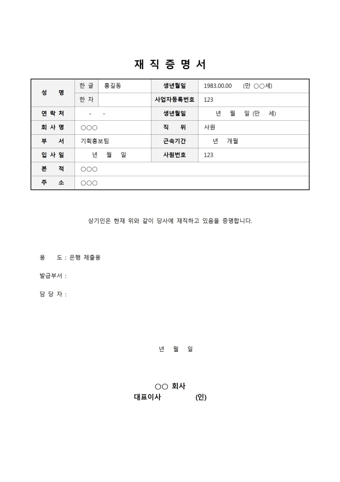9,000원/월은행제출을 용도로 재직하고 있음을 증명할 때 사용되는 재직증명서 양식입니다. 작성자의 인적사항, 발급부서, 담당자 등의 항목으로 구성되어 있습니다.