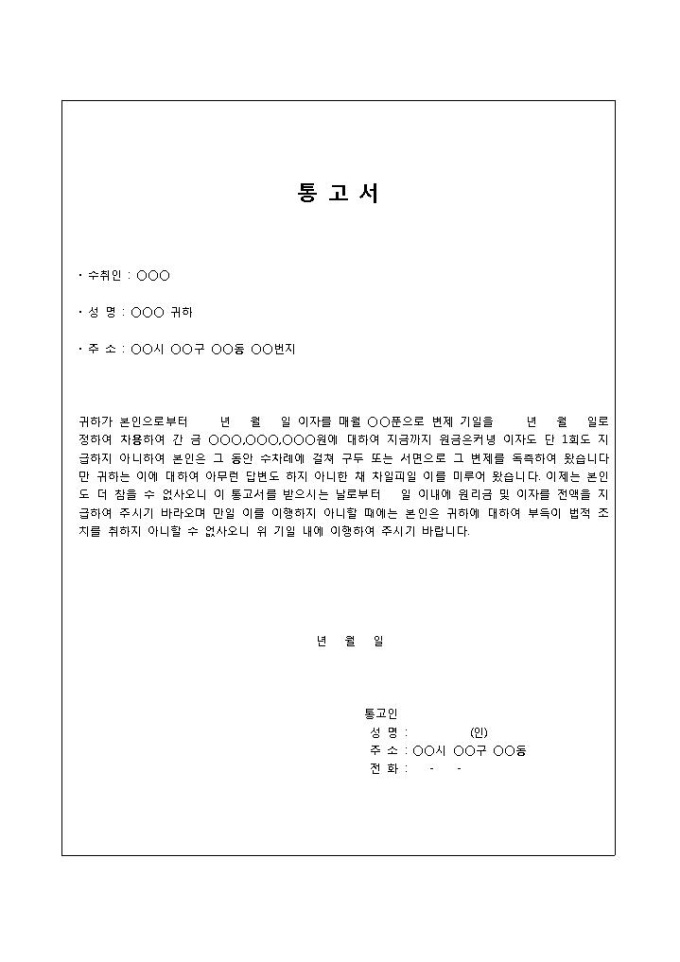 9,000원/월차용 대금의 변제를 통고 할 때 사용되는 차용대금변제 통고서 양식입니다. 수취인, 성명, 주소, 통고 내용 등의 항목으로 구성되어 있습니다.